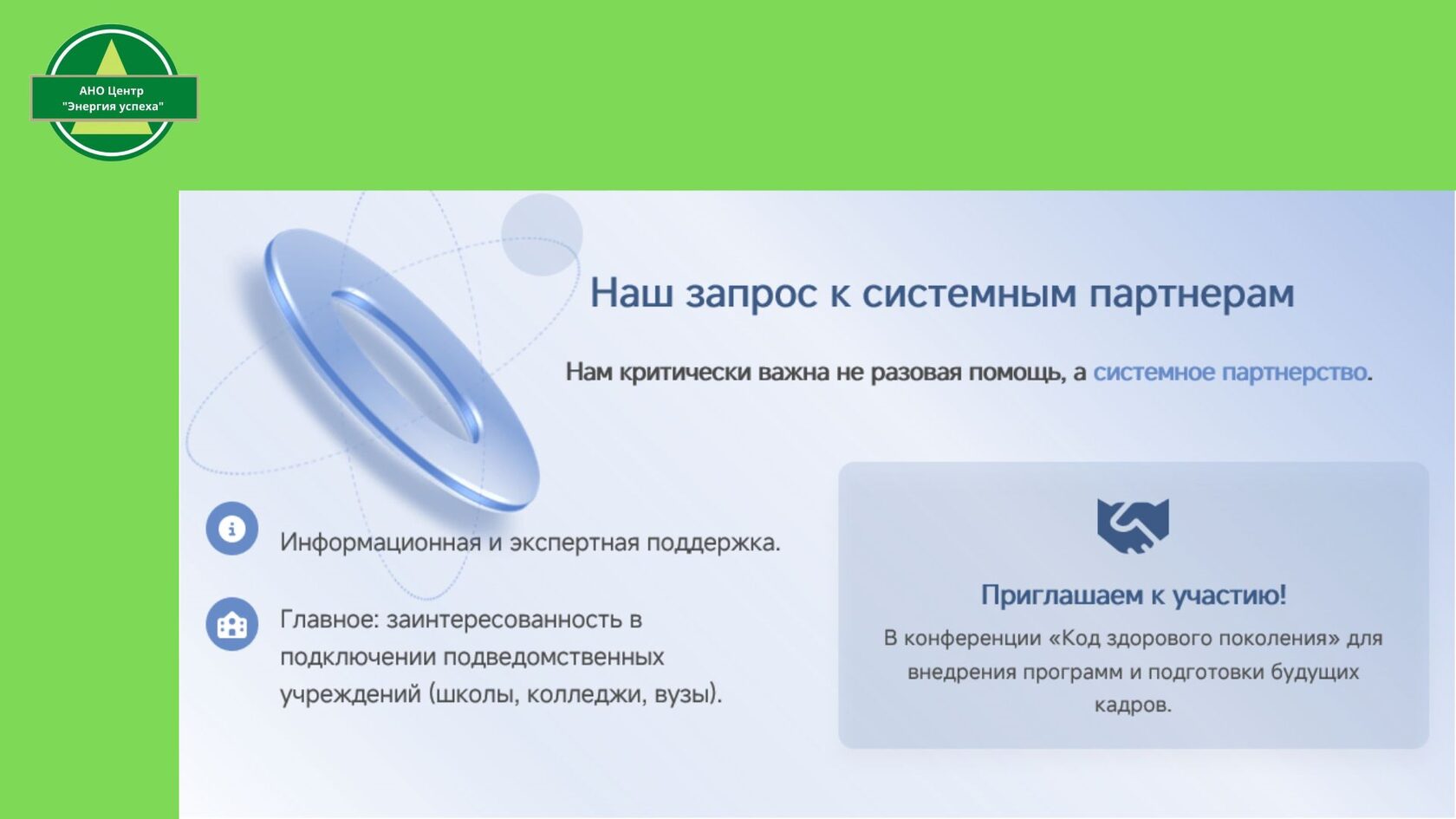 3. Вовлечение подведомственных учреждений. Речь идет о прямом диалоге с директорами школ, колледжей и вузов. Одно подключенное учреждение — это сотни подростков, получивших действенные инструменты для выбора в пользу здоровья.