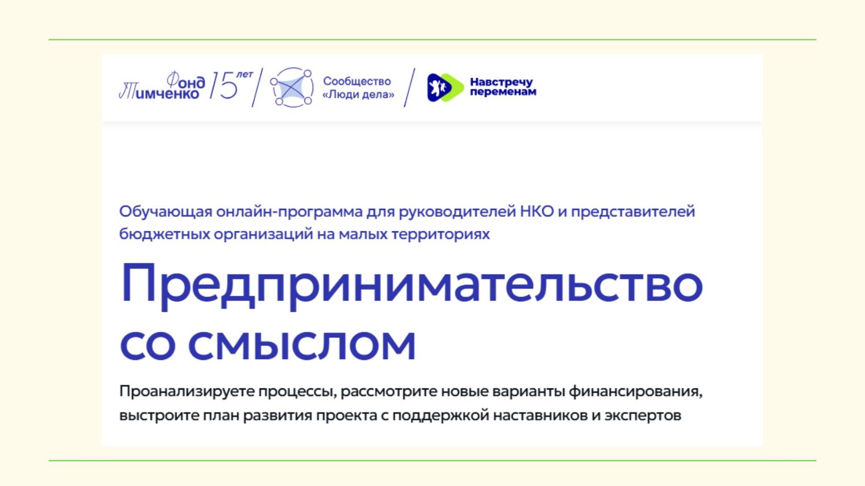 Это 8 месяцев интенсивной онлайн-работы с топовыми наставниками и экспертами для руководителей НКО и бюджетных организаций. По сути, это возможность перезагрузить подход к управлению и финансированию.