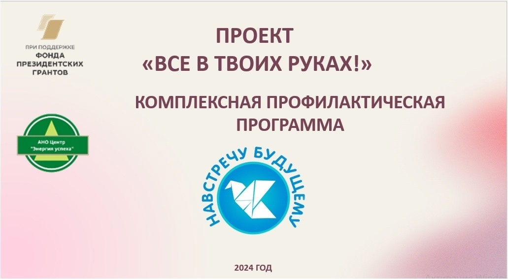 Проект «Все в твоих руках!» реализуется с использованием гранта Президента Российской Федерации, предоставленного Фондом президентских грантов